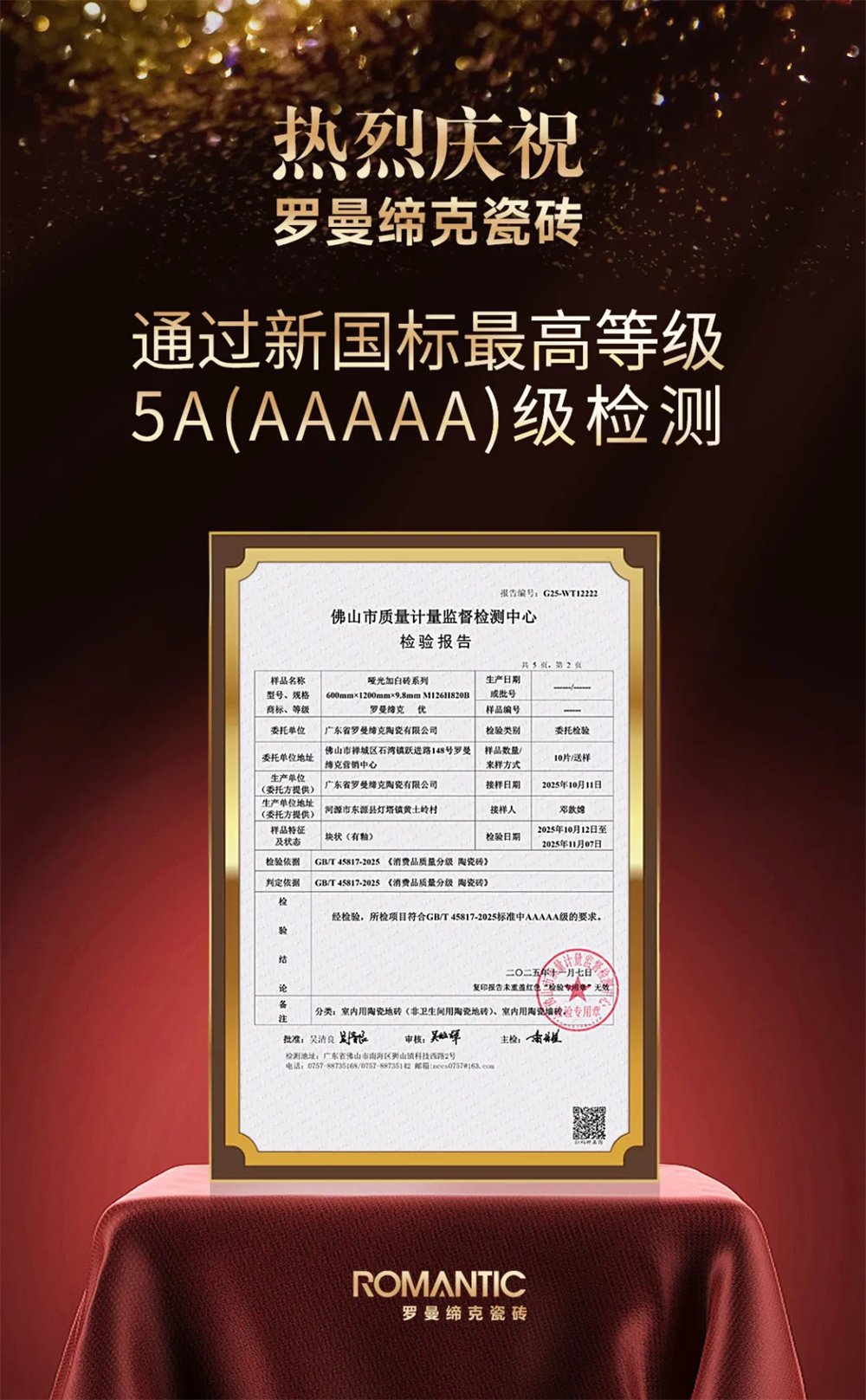近日,在國家市場監督管理總局和國家標準化管理委員會聯合發布 GB/T 45817-2025《消費品質量分級 陶瓷磚》國家標準(以下簡稱:新國標)正式實施之際,經嚴格檢驗,羅曼締克瓷磚其所檢項目符合GB/T 45817-2025標準中AAAAA級的要求,成為通過陶瓷磚新國標5A標準產品檢測的企業,為推動中國陶瓷磚質量分級體系建設樹立了標桿。