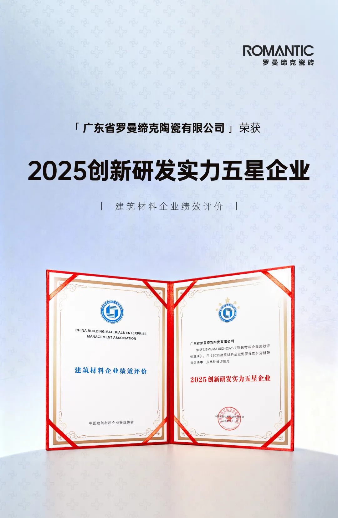 權威認證 五星實力丨羅曼締克瓷磚榮膺“2025創新研發實力五星企業”稱號